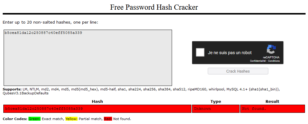 Il vous suffit donc de coller un Hash et de cliquer sur « Crack Hashes » pour vérifier si le mot de passe est dans la base du service (ça fonctionne un peut comme un moteur de recherche)