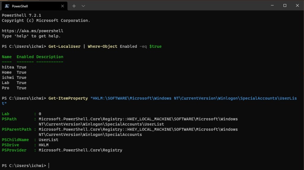 New-Item -Path "HKLM:\SOFTWARE\Microsoft\Windows NT\CurrentVersion\Winlogon\SpecialAccounts\UserList" -Force Il ne reste qu’à ajouter un Dword avec comme nom le nom de l’utilisateur et comme valeur 0