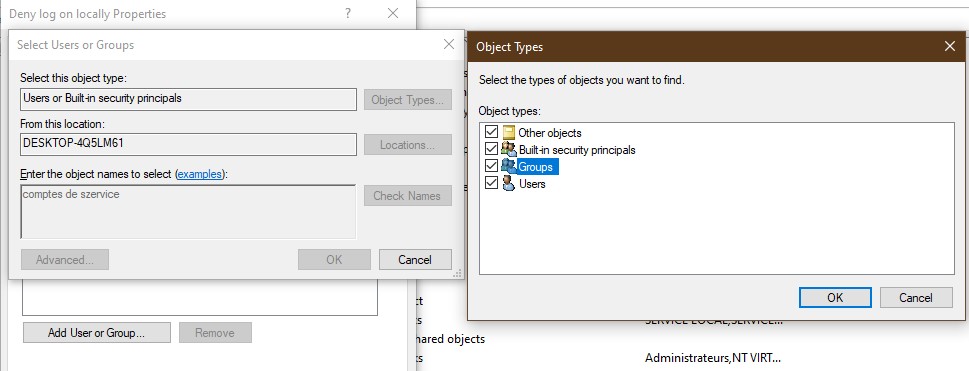 Petite astuce il faut d’abord cliquer sur « type d’objets » pour cocher la case « Groupes » et ensuite renseigner le nom complet du groupe