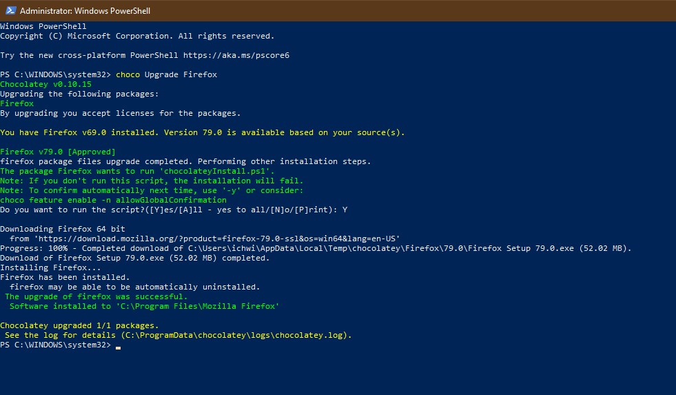 choco upgrade firefox Ou pour mettre à jour toutes les applications : choco upgrade all -y