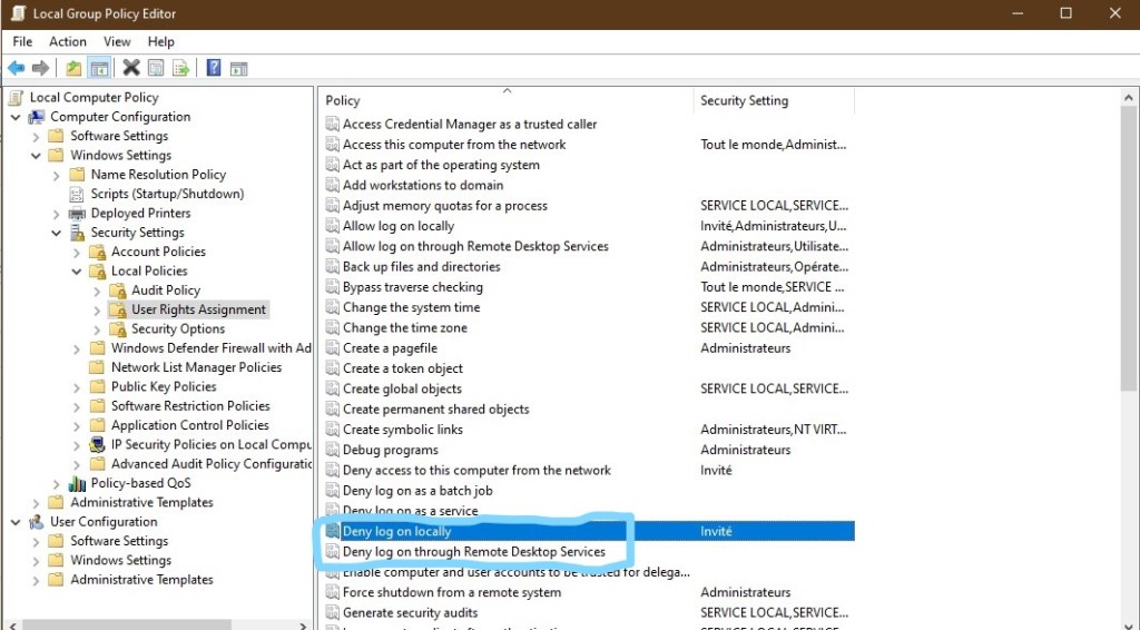 - Créer un stratégie (locale ou GPO) pour déactiver l’ouverture de session (locale et RDP) des comptes de services