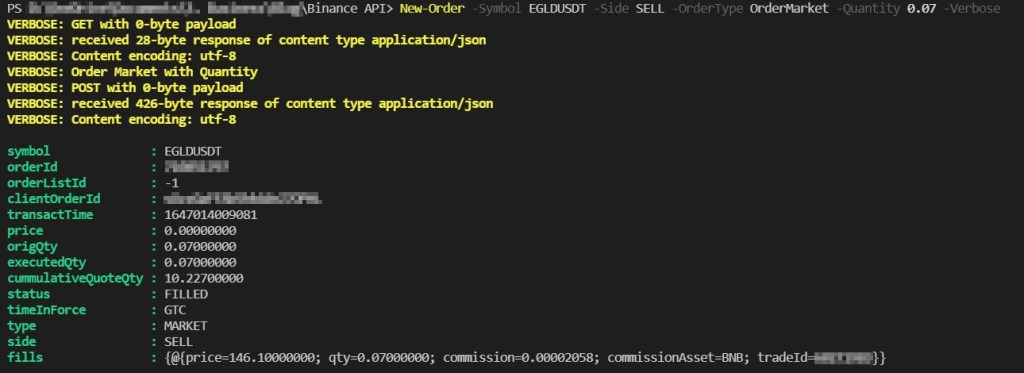 New-Order -Symbol EGLDUSDT -Side SELL -OrderType OrderMarket -Quantity 0.07 -Verbose