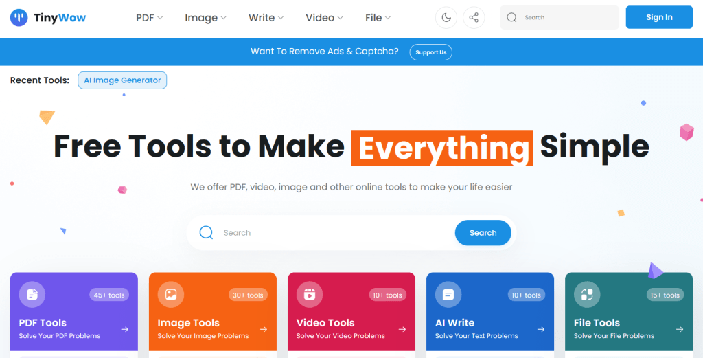 - TinyWow: Offre une multitude d’outils gratuits en ligne pour la conversion de PDF, d’images, et plus, avec une fonctionnalité de génération d’image IA pour créer des visuels uniques à partir de textes.